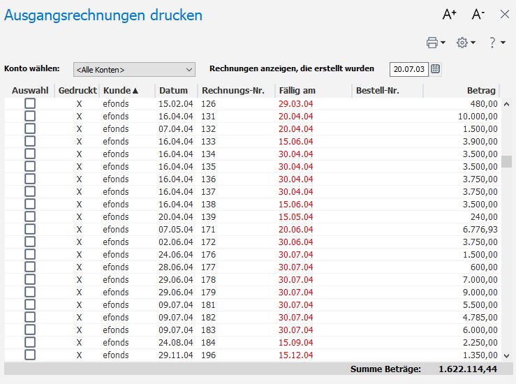 In diesem Fenster werden wahlweise alle Ihre Ausgangsrechnungen angezeigt oder nur bestimmte.