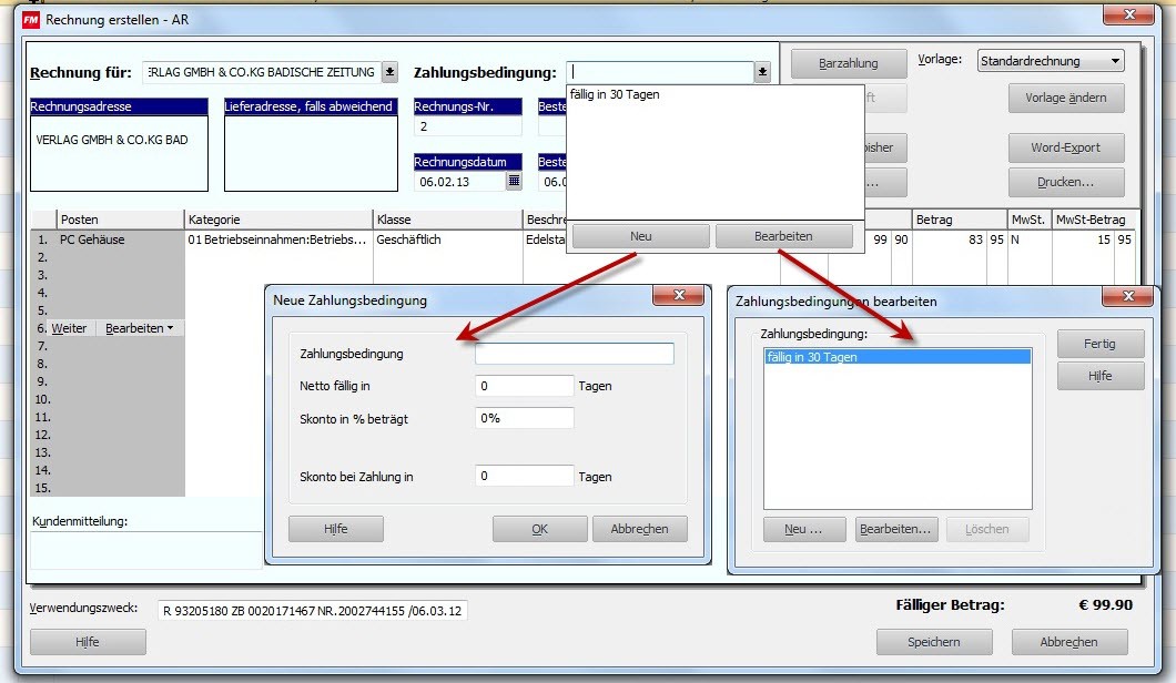 Öffnen Sie im Rechnungsformular den Dialog Zahlungsbedingungen verwalten. Sie erhalten diesen Dialog, indem Sie neben dem Feld Zahlungsbedingung die Auswahlliste öffnen und über Bearbeiten bzw. Neu das Fenster Zahlungsbedingungen bearbeiten öffnen.
