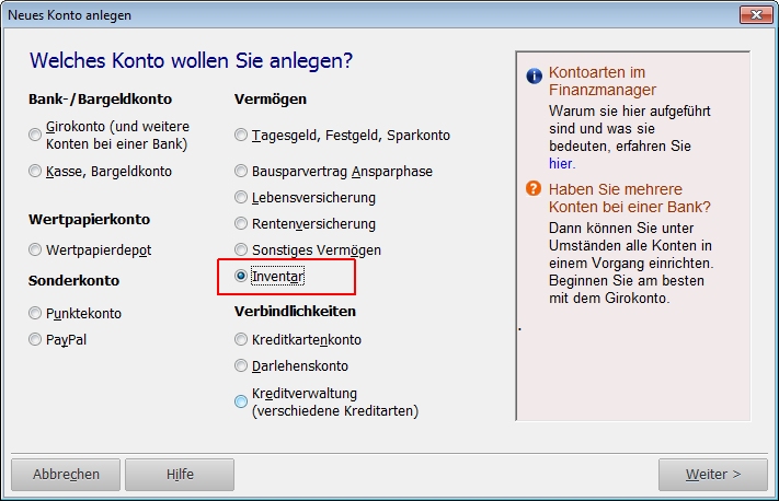 Unter Vermögen finden Sie den Eintrag Inventarkonto (nur in der Deluxe Version). Selektieren Sie den Radiobutton Inventarkonto und klicken Sie im Assistentenfenster auf Weiter.