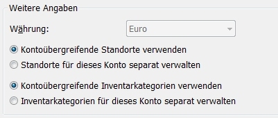Änderungen an Kategorien oder Standorten (Löschen, Umbenennen, Hinzufügen) wirken sich in allen Inventarkonten mit dieser Einstellung aus.