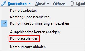 Selektieren Sie das gewünschte Konto und wählen Sie den Menüeintrag Bearbeiten und den Untereintrag Konto ausblenden.