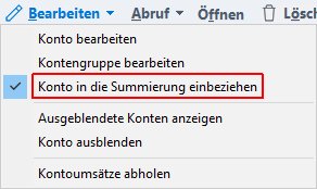 Klicken Sie dazu auf den Menüeintrag Bearbeiten und im Untermenü klicken Sie auf den Eintrag Konto in die Summierung einbeziehen.