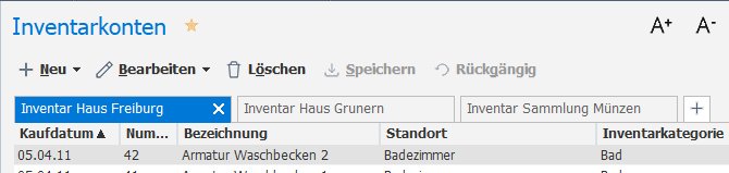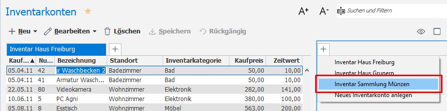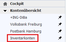 In der Navigationsleiste gibt es unter der Kontenübersicht einen Eintrag Inventarkonten. Wenn Sie auf diesen Eintrag klicken, werden in dem aufgerufenen Fenster alle Inventarkonten verwaltet.