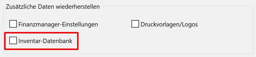 Aus diesem Grund ist bei der Wiederherstellung einer Datensicherung die Checkbox für die Inventar-Datenbank vorhanden.