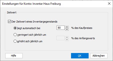 Über die Checkbox vor dem Text Zeitwert eines Inventargegenstands können Sie die Einstellung aktivieren. Ohne Aktivierung der Einstellung gilt Kaufpreis = Zeitwert.