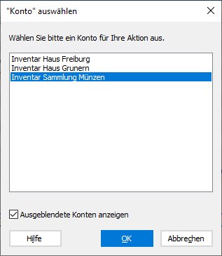 Wenn Sie den Kontextmenüeintrag Buchung zum Inventar hinzufügen gewählt haben, wird Ihnen ein Dialog zur Auswahl des gewünschten Kontos angeboten.