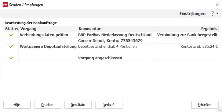 3. Ihr Online-Depotbestand wird abgeholt. Der FinanzManager informiert Sie darüber zunächst mit einer Status-Meldung. Nach Klick auf OK wird der Online-Depotbestand im FinanzManager übernommen.