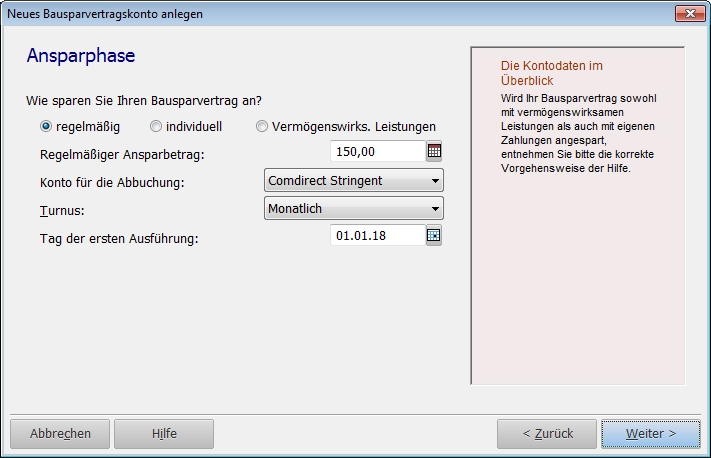 Der Vertrag kann regelmäßig, individuell oder durch Vermögenswirksame Leistungen angespart werden. Regelmäßig bedeutet, dass Sie aus eigener Tasche einen konstanten Betrag auf das Bausparkonto überweisen. Bei individuell zahlen Sie immer dann ein, wenn Geld übrigbleibt. Vermögenswirksame Leistungen bedeutet, dass Ihr Arbeitgeber den regelmäßigen Betrag einzahlt. Wenn Sie darüber hinaus noch aus eigener Tasche regelmäßig einzahlen, müssen Sie dafür manuell eine zusätzliche regelmäßige Buchung einrichten.