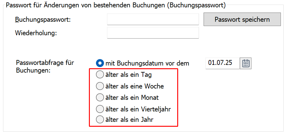 Wenn Sie ein Passwort für Buchungen einrichten, können Sie keine Änderungen an Buchungen vornehmen, die vor einem angegebenen Datum liegen, es sei denn, Sie geben das richtige Passwort ein.
