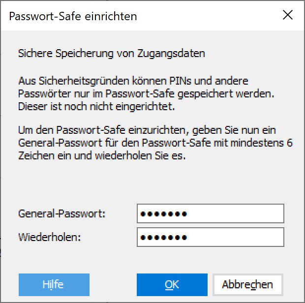 Wenn Sie den Passwort-Safe zum ersten Mal verwenden, öffnet sich dieses Dialogfenster, in dem Sie aufgefordert werden, ein General-Passwort einzugeben.