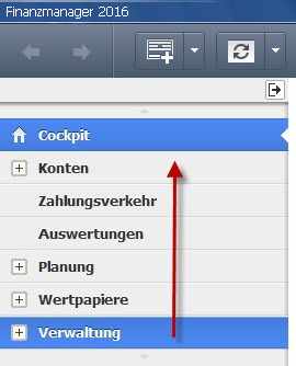 Die verschiedenen Funktionsbereiche der Navigationsleiste sind beim Start des FinanzManagers geschlossen. Die einzelnen Bereiche können durch einen Klick auf das + expandiert werden.