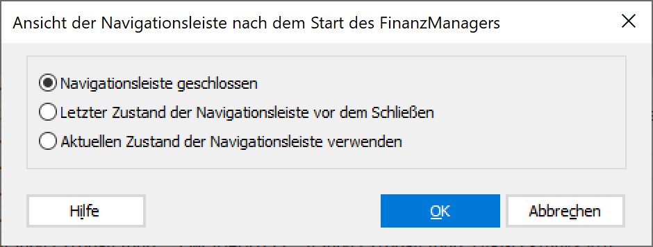 Ist diese Option gewählt wird die Navigationsleiste beim Öffnen in dem Zustand angezeigt, der beim Beenden des FinanzManagers vorlag.