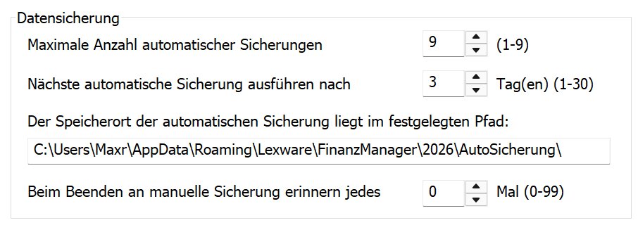 Der FinanzManager erzeugt automatisch alle sieben Tage eine Sicherungskopie Ihrer aktuellen FinanzManager-Datei und speichert diese in einem Verzeichnis AutoSicherung ab.