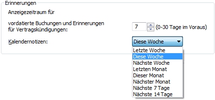 In diesem Dialogfenster legen Sie fest, wie viele Tage Im Voraus (0-30) Sie an vordatierte Buchungen erinnert werden wollen.