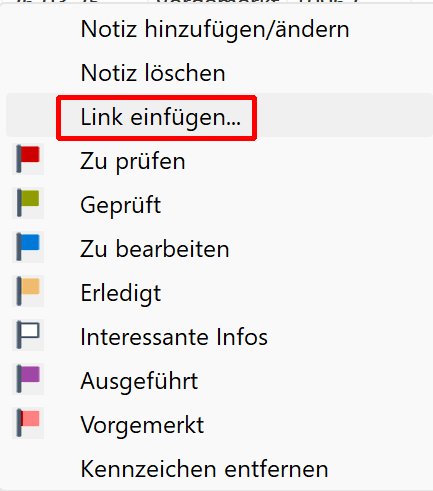 Auch beim Klick auf das Symbol und nachfolgender Anzeige des Kontextmenüs ist der Eintrag Link einfügen… ergänzt worden.