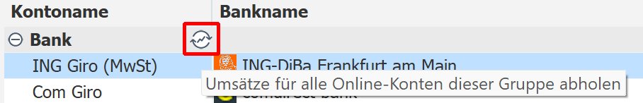 In der Kontenübersicht kann über ein Icon auf Gruppierungsebene die Umsatzabholung für alle Online-Konten dieser Gruppe gestartet werden.