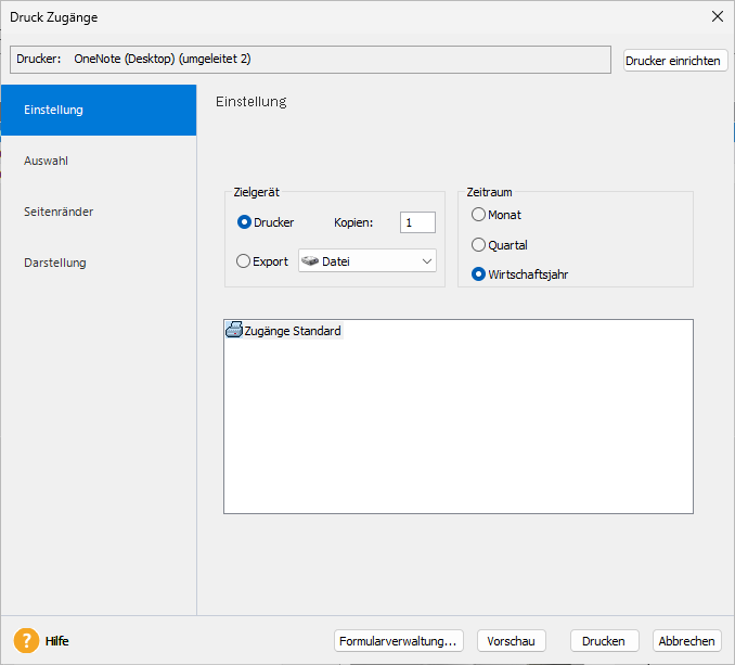 Das bedeutet: Neben den Standard-Elementen eines Druck-Dialogs gibt es individuelle Bereiche, die von der Eigenschaft der Auswertung abhängen.